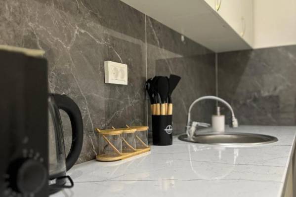 В номере есть кухня и плита, но нет чайника. Это самое первое что должно быть, если есть кухня.Большие просторные номера, наличие кухни, доступ в интернет на высокой скорости.